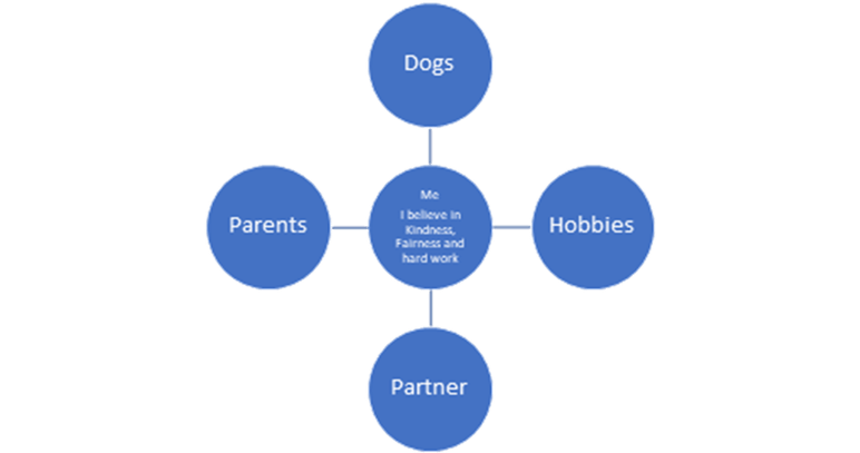 - My Core – when things seem overwhelming, uncertain or negative, it is easy to lose touch with the things that are more positive, constant and psychologically safe. It can be really helpful at times like these to pause and encourage ourselves to reconnect mentally with some things that ground us. These mental images can be whatever works for you, although they do need to be, positive, real and meaningful . Examples could be; what are you grateful for? Who cares about you and has your best interests at heart? What are your values? A memory of happy times, If you were at the centre of a spider diagram, what positive things would be around you? Here is an example from someone I have worked with who is happy to share.
